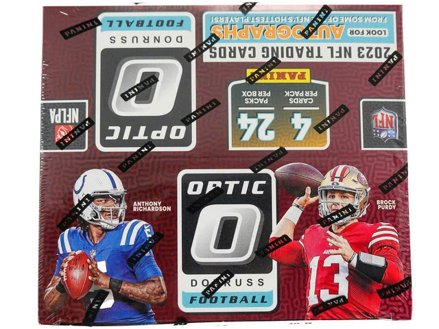 The flagship Donruss Football epically meets Optichrome technology with 2023 Panini Donruss Optic Football, a dynamic product featuring Donruss' trademark bells and whistles such as Rated Rookies, My House!, Downtown and more. Look for on-card autographs from this season's hottest rookies in Rated Rookies RPS Autographs. Donruss Optic Football boasts a robust parallel roster featuring must-chase versions such as Flex, Electricity, Jazz, Black Pandora and more.