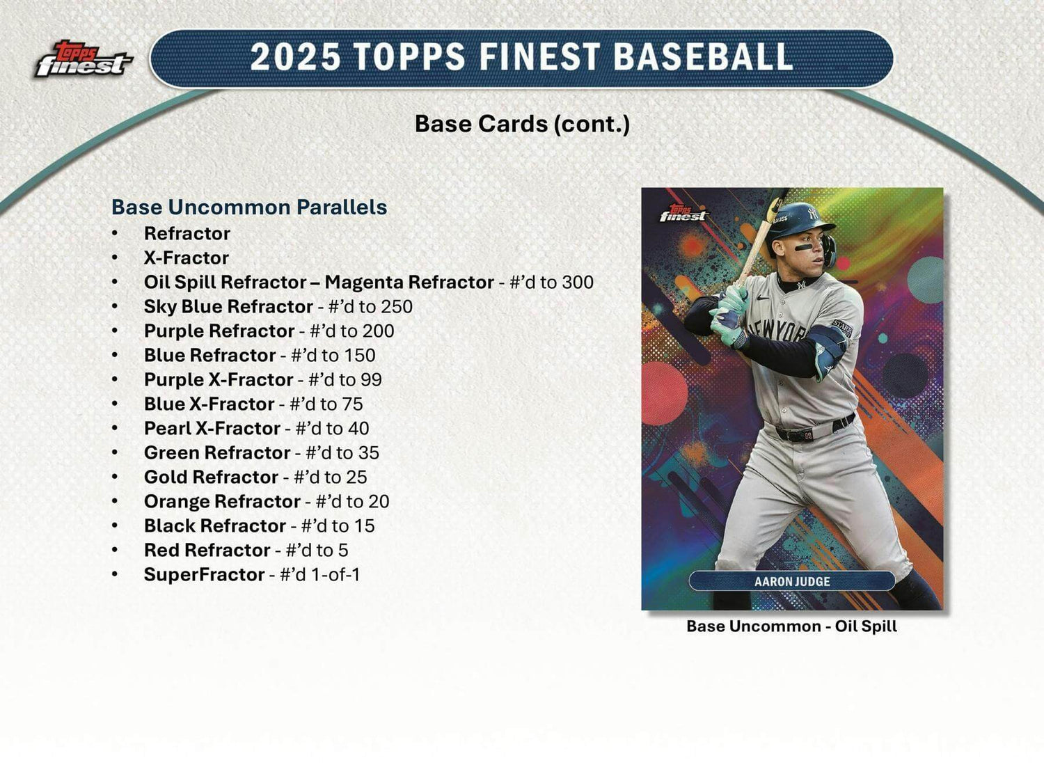 2025 Topps Finest Baseball returns with the thee tiered base set, in a new bright and colorful design.