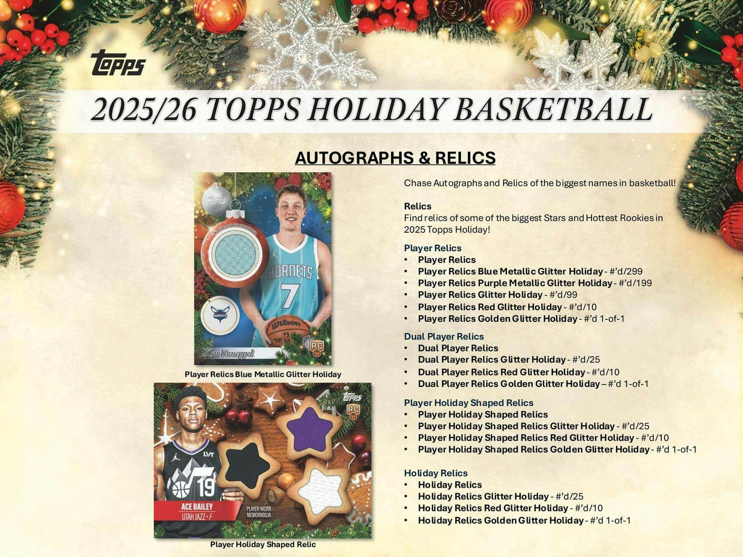 Arriving in time for the Holiday Season, 2025 Topps Holiday Basketball looks to bring all the thrills of the season to collectors everywhere. Featuring the top Rookie and Veteran players from the NBA!