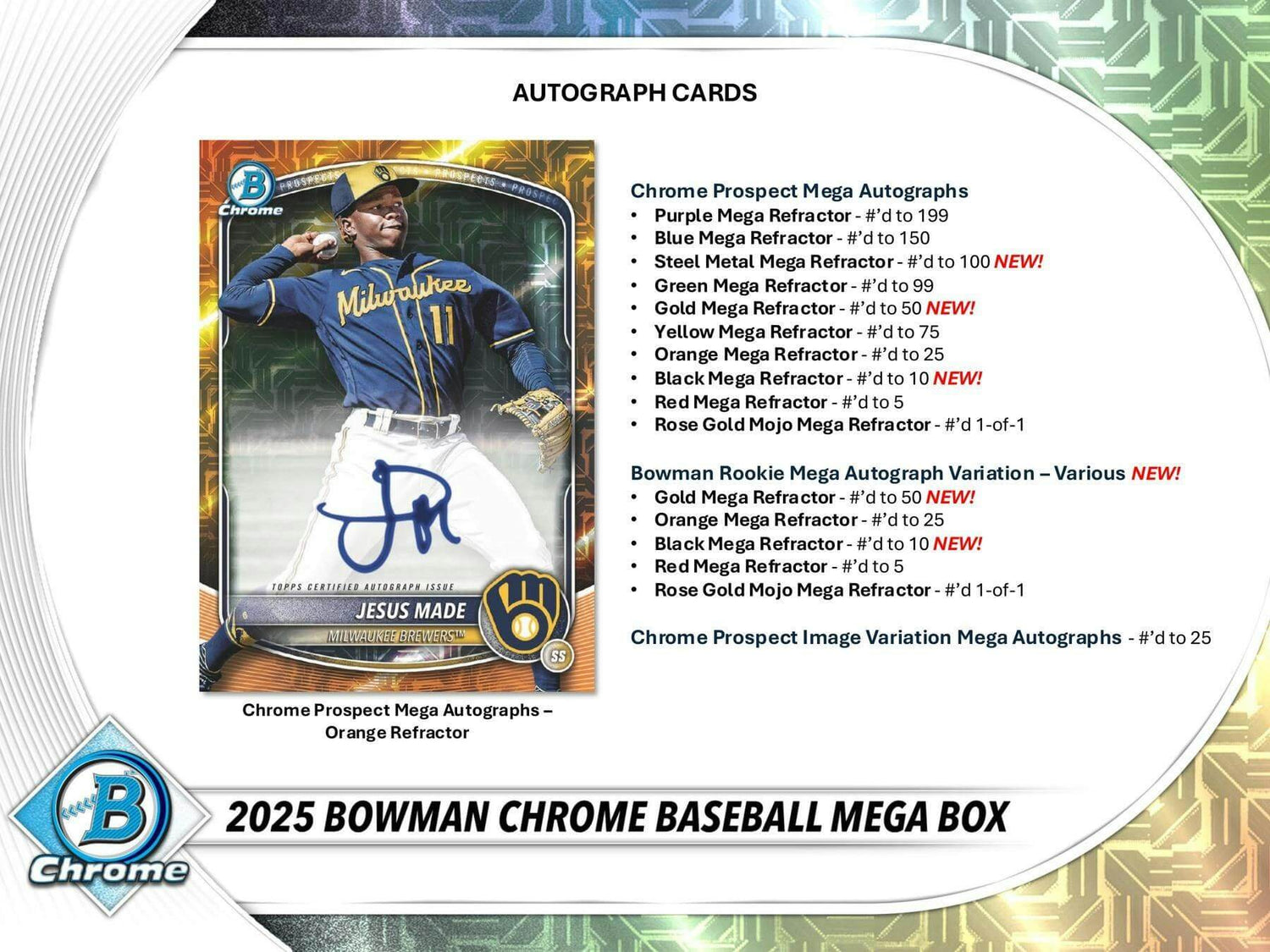 Look for the top-50 Chrome Base Set and top-50 Chrome Prospect cards 2025 Bowman Chrome on exclusive Mega Chrome!