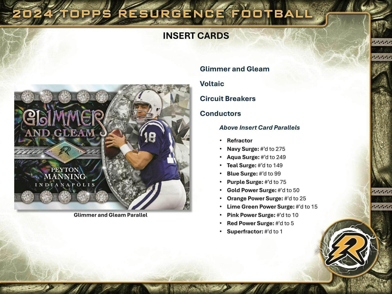 Topps is bringing the power to the cards in the brand-new Resurgence Football! Making its debut, 2024 Topps Resurgence Football is finally here. Look for cards of the most electrifying athletes in all of football!