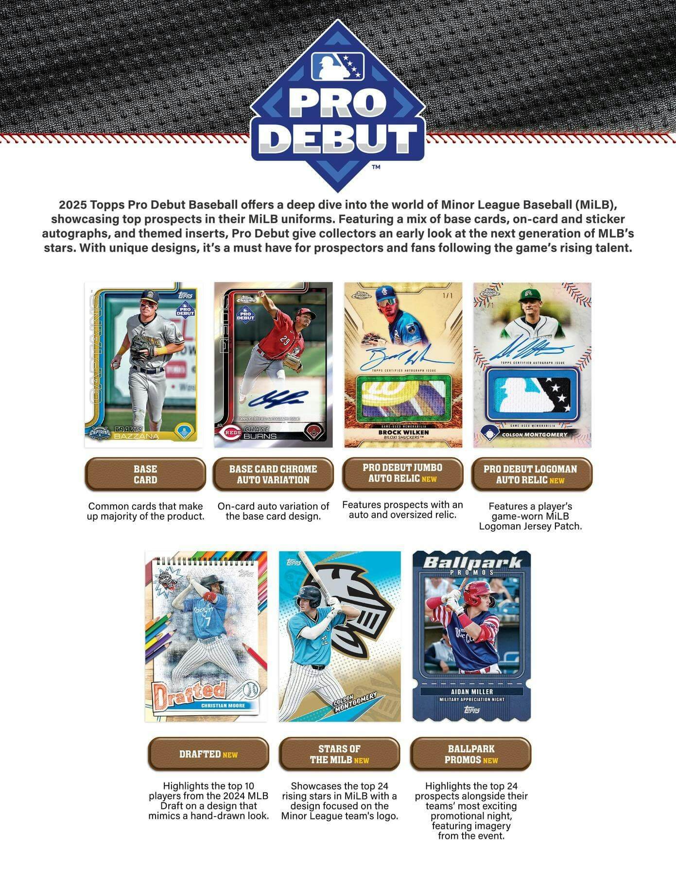 2025 Topps Pro Debut delivers the next generation of greatness! Featuring fresh inserts, Chrome autographs, and can't-miss prospects, this is where the journey to the big leagues begins.