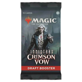 Each Draft Booster contains 15 Magic cards, 1 token or ad card, and 1 Helper card, with a combination of 1 Rare or Mythic Rare, 3 Uncommons, 10 Common cards, and 1 Land card. A traditional foil card of any rarity replaces a Common in 33% of Innistrad: Crimson Vow Draft Boosters.