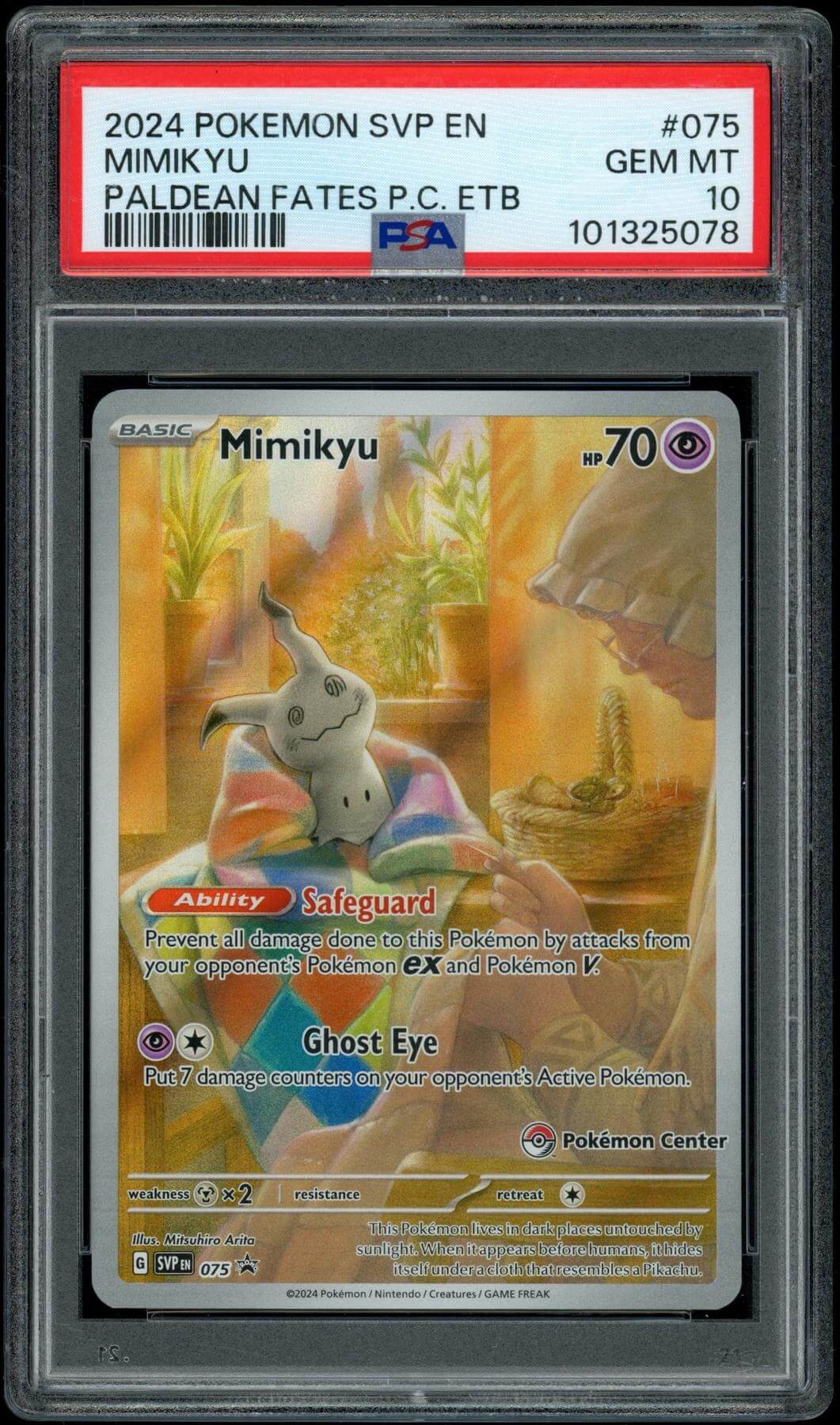 - 2024 Paldean Fates Pokemon Center Stamp ETB Mimikyu PSA 10