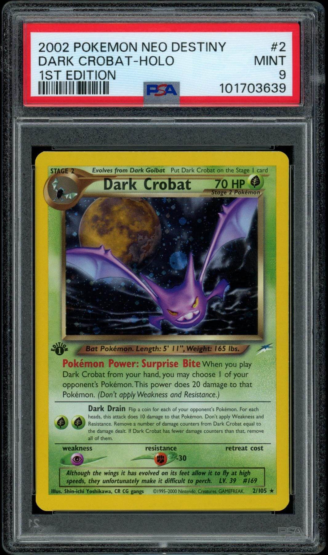 Each box contains one (1) Graded Pokémon card featuring only spooky Pokémon - Bugs, psychics, bats, ghosts, poison types, dark types, dragon types and more spooky Pokemon from the TCG, Carddass, and Topps!