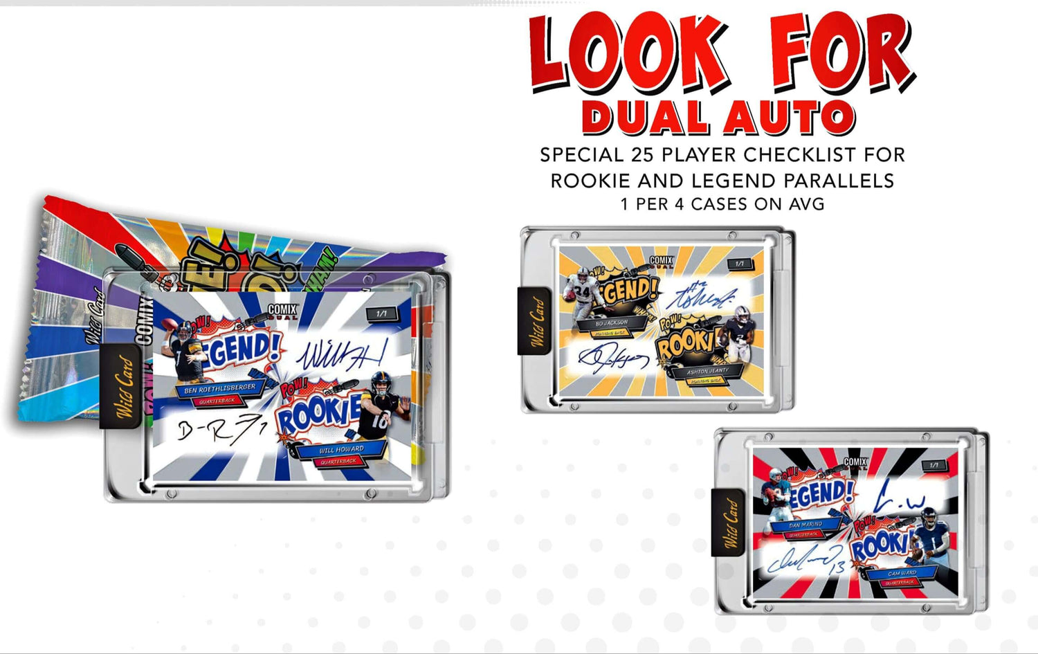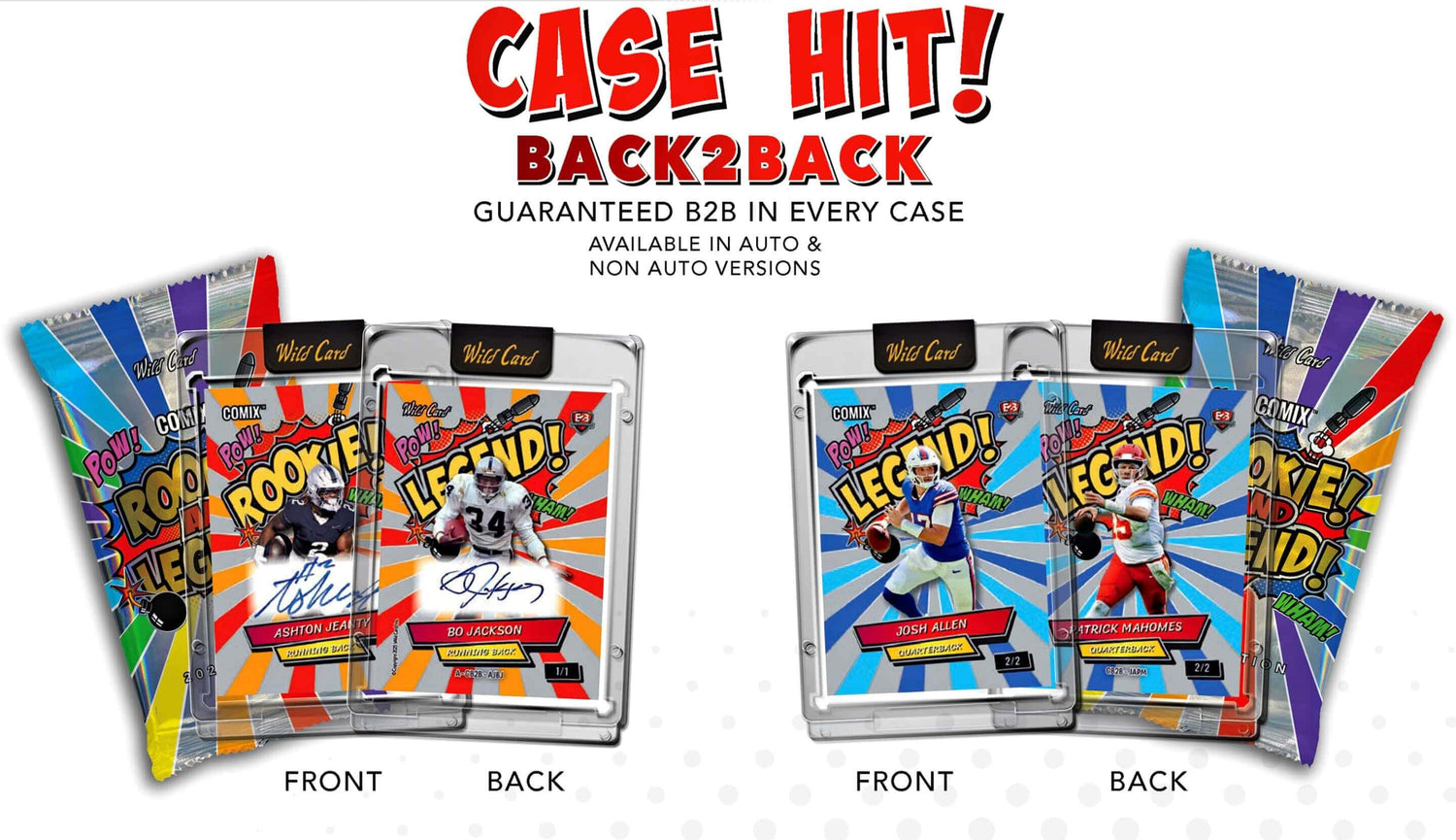 The 2025 Wild Card COMIX Rookies and Legends Hobby Box contains five Limited Edition Comix Cards, each numbered 25 or less, encased and individually foil-wrapped. Each box features 50 premium player cards from the 2025 NFL class, with cases including average of four autographs, one Back2Back dual autograph, and one true one-of-one color match.